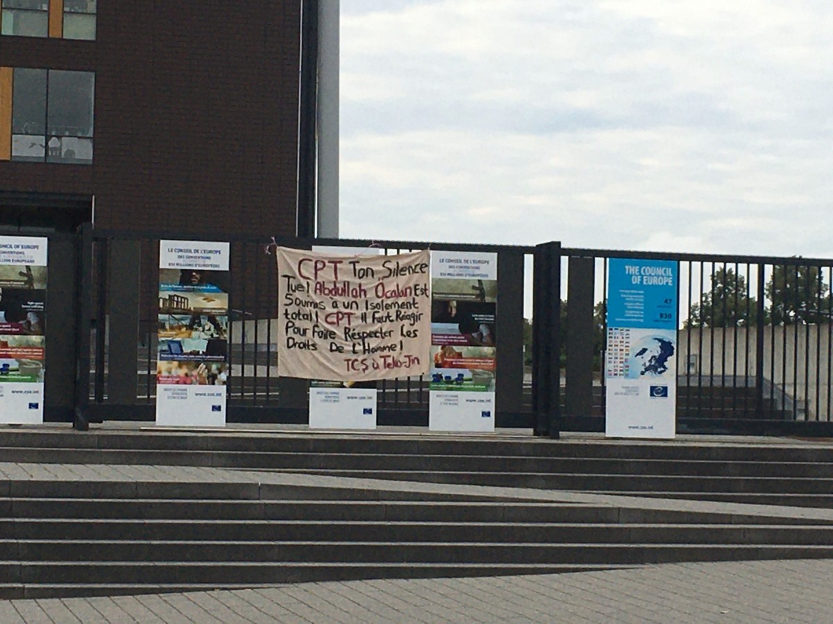 Li ser pankata bi Fransî ‘CPT bêdengî dikuje!, Tecrîdeke mutlaq li ser Abdullah Ocalan heye!, CPT ji bo rêzdayîna mafê mirovan divê nerazîbûn bên nîşandan!’ hatibû nivîsîn.