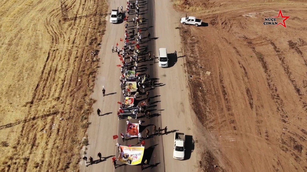 Ciwanên Rojava ku serê sibehê ji bajarokê Rimêlanê birêketin, piştî meşa 16km’yî gihiştin gundê Xaneserê.