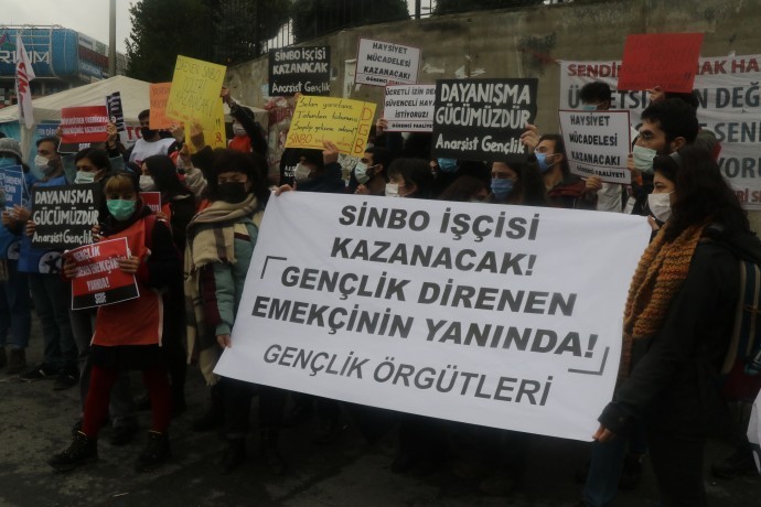 Rêxistinên ciwanan ên ku ji pekhate, tevger û partiyên siyasî pêk tên, karkerên Sînboyê yên ku li dijî pêkanîna destûra bêpere 30 roj in li ber xwe didin ziyaret kirin. Polîsan xwest ciwanan asteng bikin lê li gel vê yekê jî ciwan bi dirûşmeyan çûn konê berxwedanê yê li pêş Kargeha Sînboyê. Ciwanan pankarta “Wê karkerên Sînboyê serbikevin. Ciwan bi kedkarên ku li ber xwe didin re ne” vekirin û bê navber dirûşmên “Yekitiya karkeran wê sermayeyê têk bibe” û “Greva giştî, berxwedana giştî” berz kirin. Ciwanan li pêş konê berxwedanê yê karkeran kursuya serbest danîn û hin axaftin kirin.