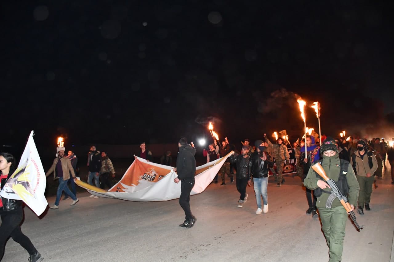 QAMÎŞLO – Bi armanca li dijî êrîşên dewleta Tirk a dagirker û îxaneta PDK, tevgera ciwanên şoreşger a herêma Cizîrê meşek dirêj ji Til Temir heta Dêrik daye destpê kirin. Ji Til Temir heta Hesekê, ji Hesekê heta Amûdê, ji Amûdê heta Qamişlo. Ciwanên şoreşger meşa xwe di roja 3’mîn de didome.
