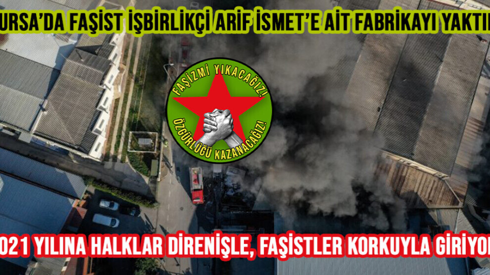 NAVENDA NÛÇEYAN – Tevgera Şoreşgerî ya Yekbûyî ya Gelan (HBDH) daxuyaniyek da û ragihand 31’ê Kanûnê li navçeya Osmangazî ya Bûrsayê fabrîqeya kesê bi navê Arîf Îsmet Terzîoglû yê AKP’î ku li qadeke 500 metreyî ye hatiye hedefkirin û kargeh bi temamî hatiye rûxandin, 1 milyon lîreyê Tirkî ziyan gihiştiye hevkarê AKP’î.
