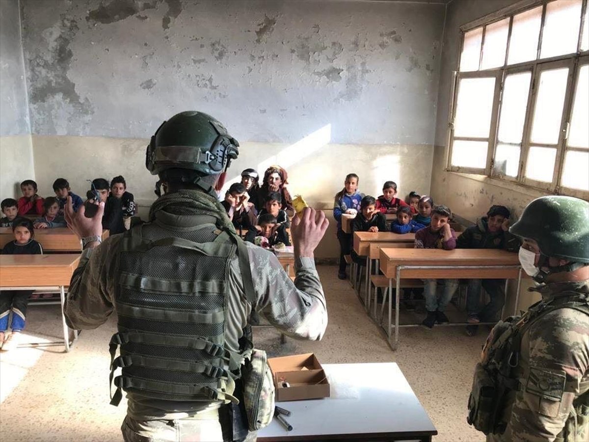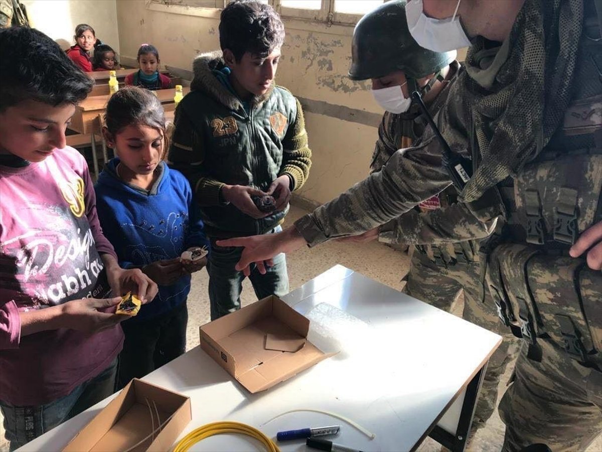 Tiştên ku dîmenan de dixwiyên leşkerên Tirk dersa teqemeniyê didin zarokan.
