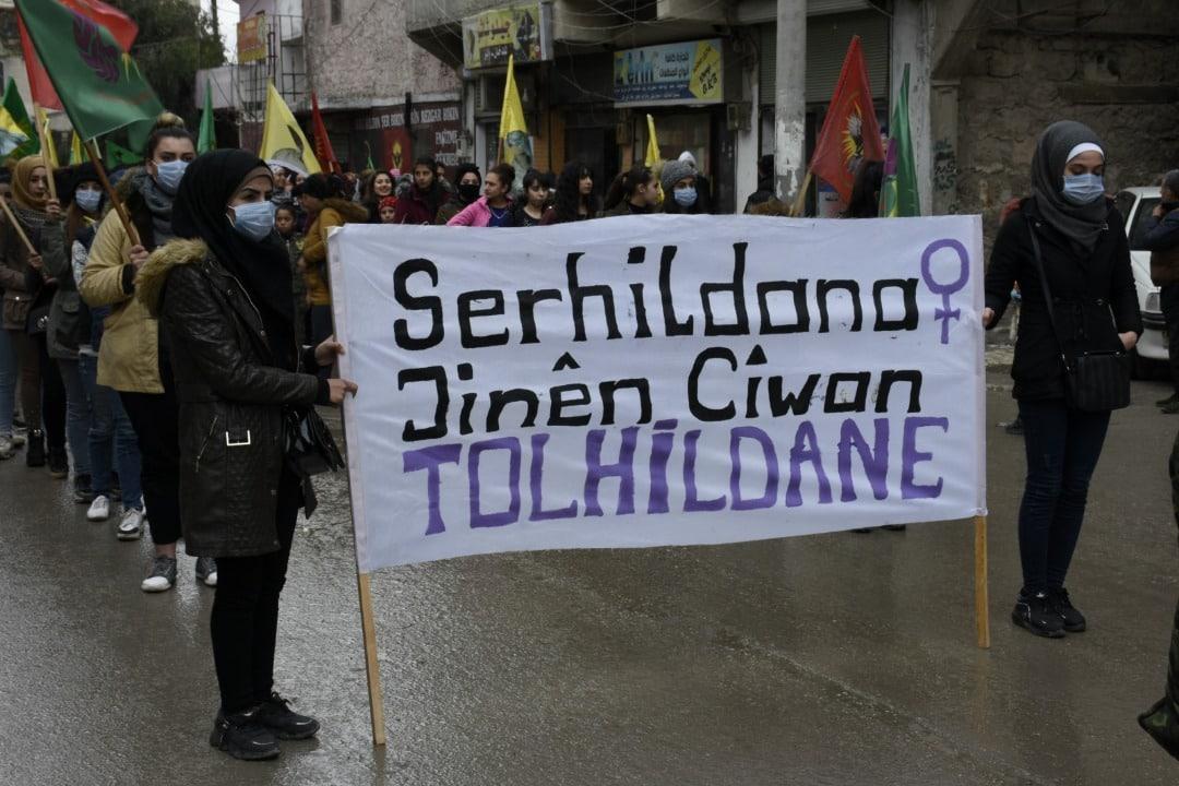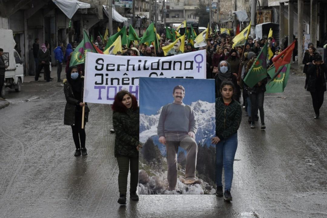 Xwepêşandêr li pêşiya navenda Yekitiya Ciwanên Şoreşger ên Sûriyê li rojavayê taxa Şêxmeqsûdê kom bûn. Xwepêşandêran wêneyên rêber Abdullah Ocalan, alên Yekitiya Jinên Ciwan û kongereya Star rakirin û siloganên “Bi serhildana jinên ciwan em ê tolê hildin” berz kirin.