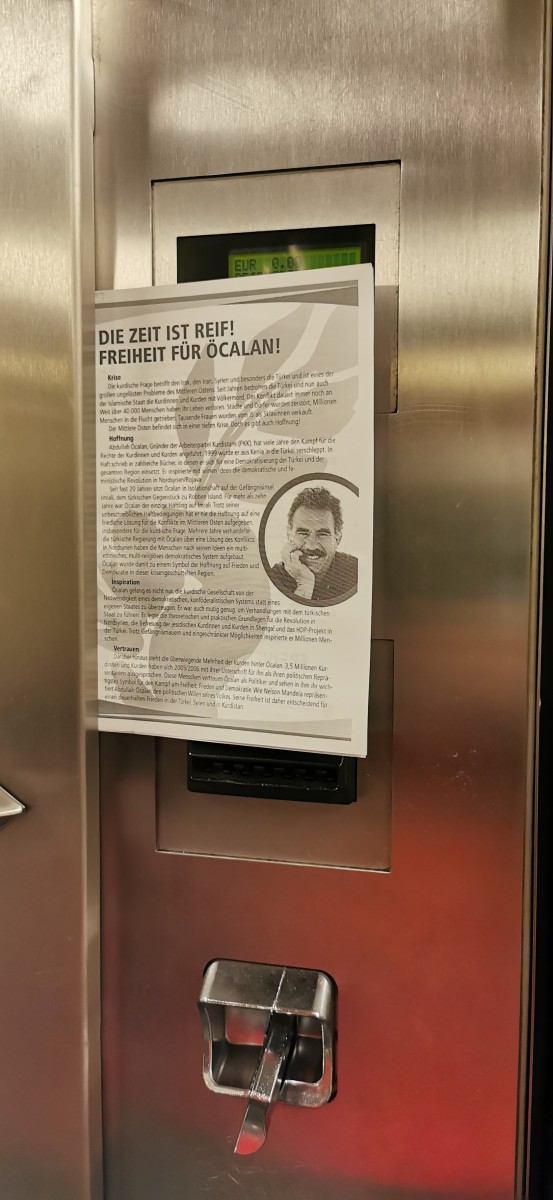 Aktivîstên saet 15:00’an hatin ba hev li gelek trenan sware bûn û li ser tecrîda sîstematîk a li ser Rêberê Gelan agahî belav kirin. Ciwanan li nava trenan posterê Abdullah Ocalan vekirin û bê navber dirûşmên bi zimanê Elmanî ‘Ji Ocalan re azadî, ji Kurdistanê re aştî’ û ‘Bijî Ocalan’ qîr kirin.