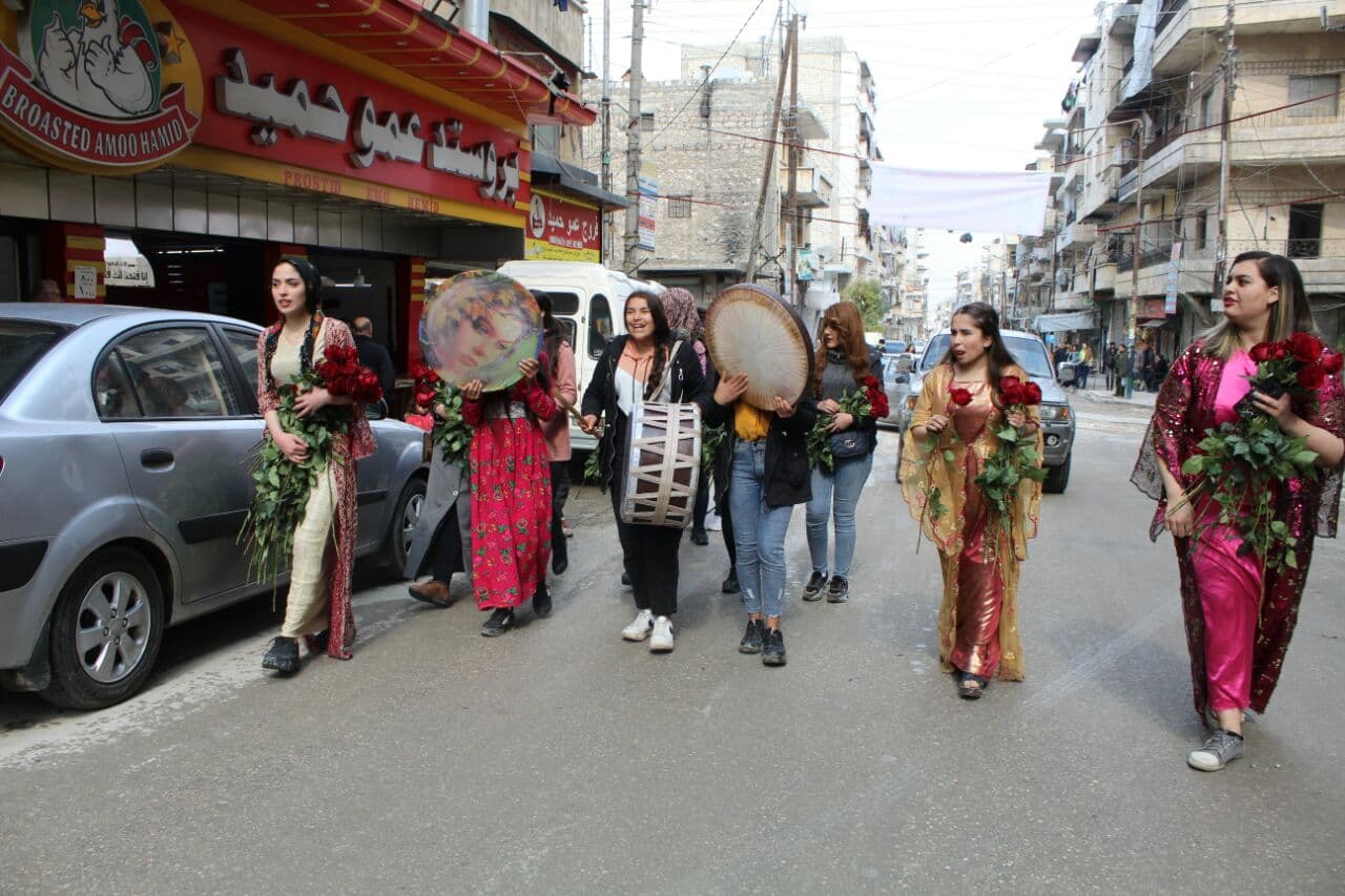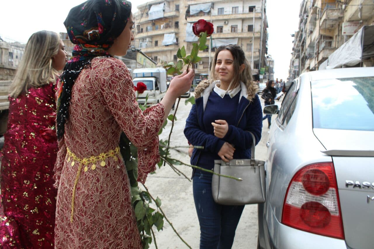 Îro jî, jinên ciwan ên li taxa Şêxmeqsûd a Helebê bi cilên û bergên xwe yên herêmî daketin kolanan û sorgul belav kirin. Jinên ciwan di çarçova 8’ê Adarê Roja Jinan de, bi dengê erbane û defan ve, gul belav kirin. Jinên ciwan ji raya giştî eleqeyek mezin girtin.
