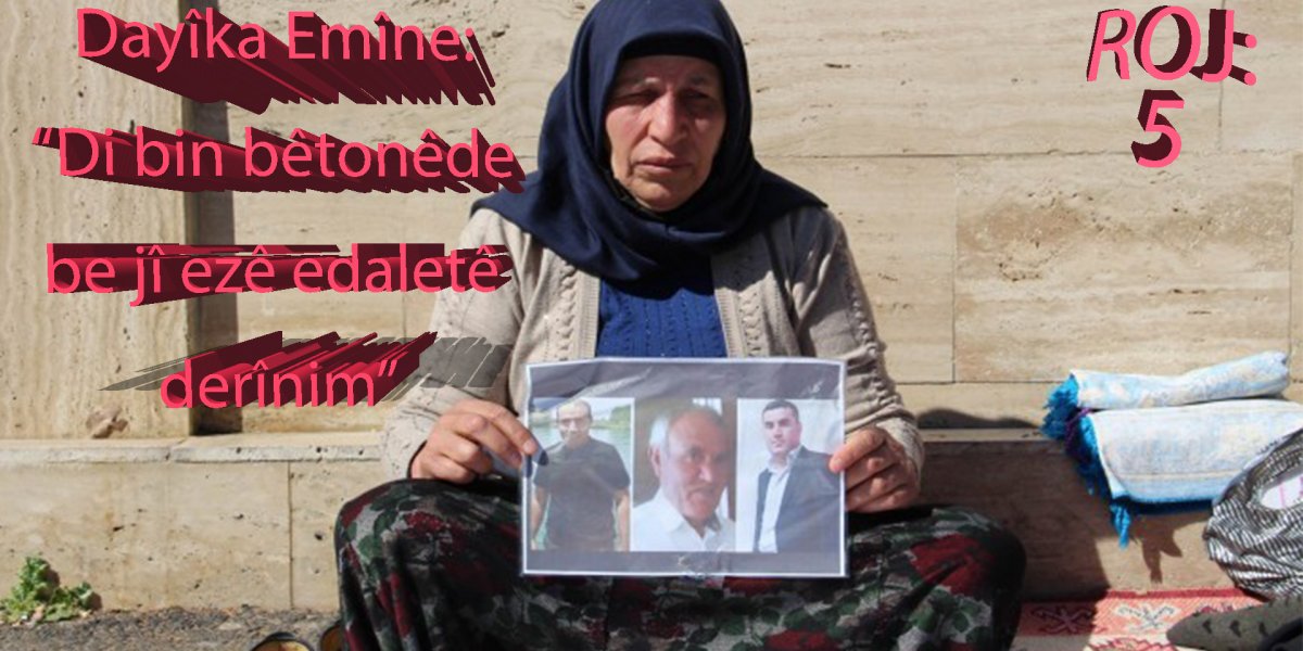 Têkoşîn edaletê ya Emîne Şenyaşar a hevjînê xwe Hecî Esvet Şenyaşar û du kurên xwe Adil û Celal Şenyaşar, di encama êrişa parazvan û xizmên parlamenterê AKP’ê Îbrahîm Halîl Yildiz de ya berî hilbijartina 24’ê Hezîranê winda kirin, dewam dike. Çalakiya bi daxwaza “Edaletê” ya Emîne Şenyaşar û kurê xwe Ferît Şenyaşar li ber Edliya Rihayê dest pê kirin, di roja 5’emîn de, dewam dike.