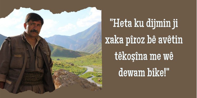 Di vî şerê qirkirinê de ku bi komploya 1999’an re tê heman wateyê û ew dide destketiyên têkoşîna me ya 40 salî ji holê rake, em hemû hevrêyên xwe yên li qadên Mamreşo, Şehîd Serdar û Zendûrayê di tuneyên şer de bi ruhê fedayî yê Apoyî sekneke lehengiyê nîşan didin û rê nadin dijmin, silav dikin û ji niha ve serketina wan pîroz dikin. Her wiha hemû hevalên di pêngavên Bazên Zagrosê û Cenga Xabûrê de ne silav dikin ku gav bi gav li Zagrosan dijmin dişopînin û nîşanî dijmin didin ku mîna baz xwe berdidin nava wan.”