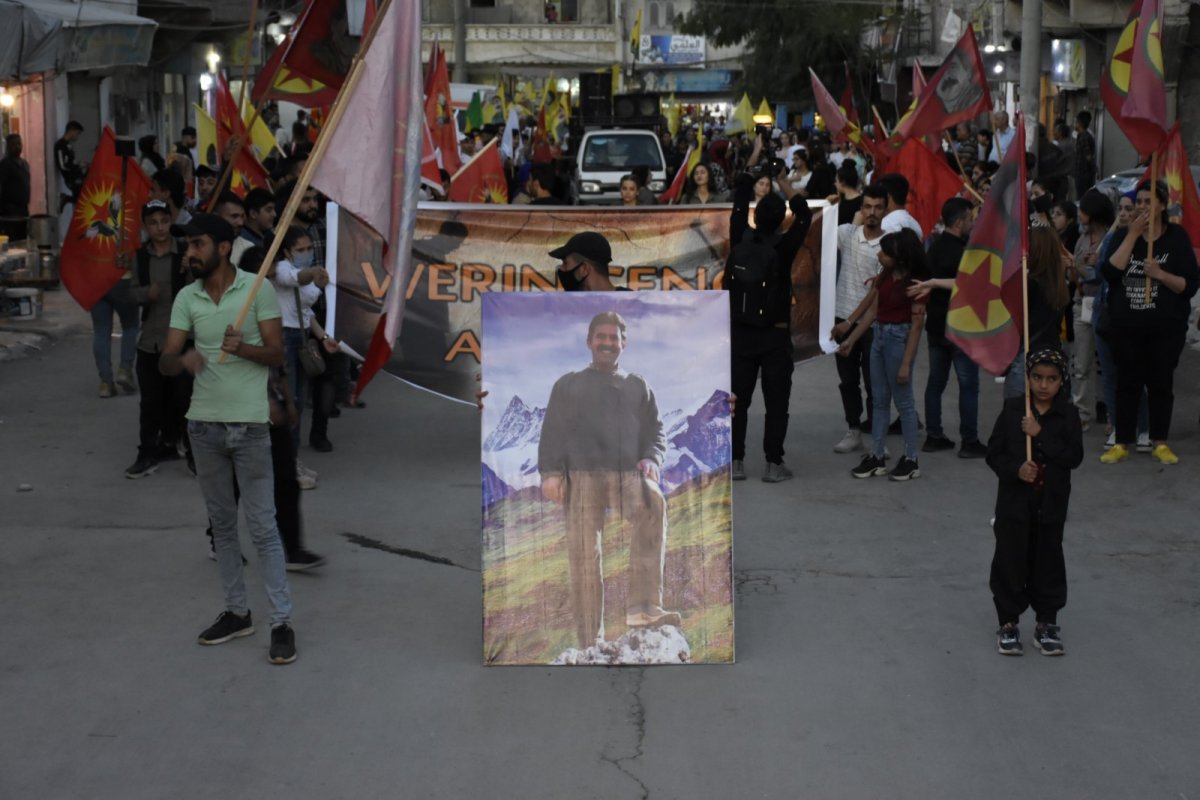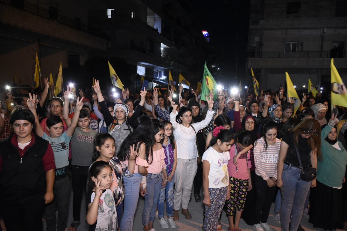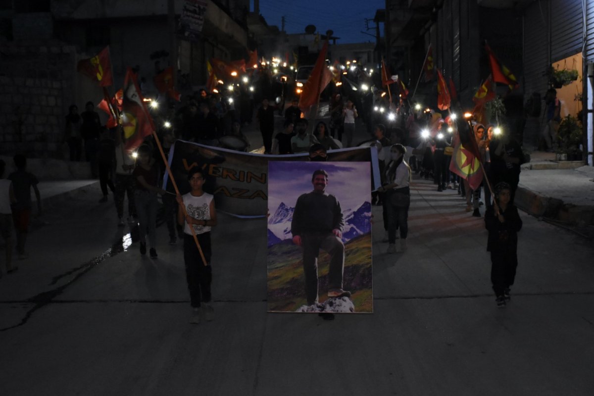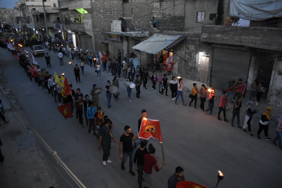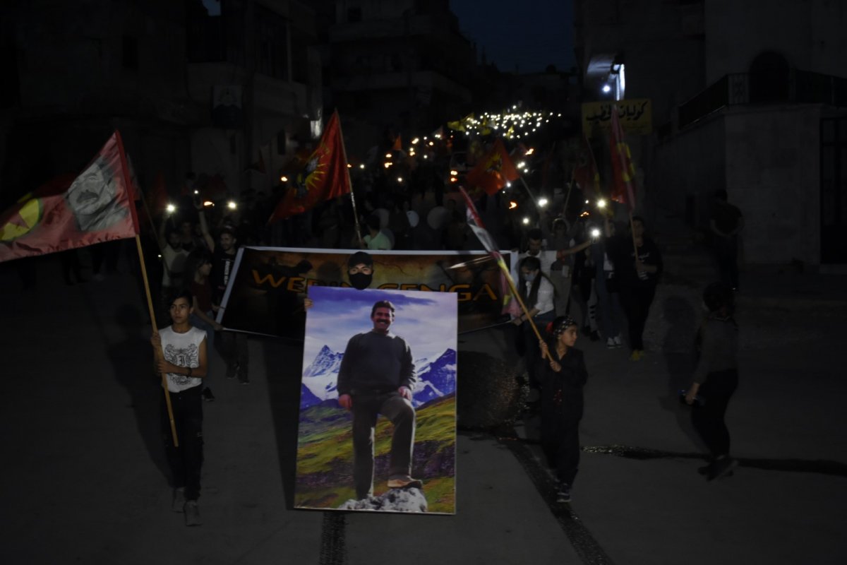 HELEB – Ciwan li pêş Navenda Tevgera Ciwanên Şoreşger ên Sûriyê ya li beşa rojavayê taxa Şêxmeqsûdê ya Helebê kom bûn û wêneyên rêber Abdullah Ocalan, alên tevgera ciwanan, alên PYD’ê û meşale hilgirtin.