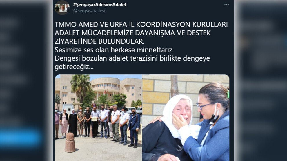 Malbatê li ser hesabê xwe yê medya dijîtal di parvekirina kir de, spasiya endamên Lijneya Koordînasyona Rihayê (ÎKK) û Yekîtiya Odeyên Endezyar û Avahîsazên Tirk (TMMOB) a Amedê yên duh serdana wan kiribûn kir. Malbatê, di parvekirina xwe de ev peyam da: “Lijneyên Koordînasyona Riayê (ÎKK) û TMMOB’a Amedê serdana piştevaniyê ya têkoşîna edaletê li me kirin. Minnetdarê hemû kesên ku dibin dengê me. Em ê bi hev re mêzîna edaletê ya xirab bûye hevseng bikin.”