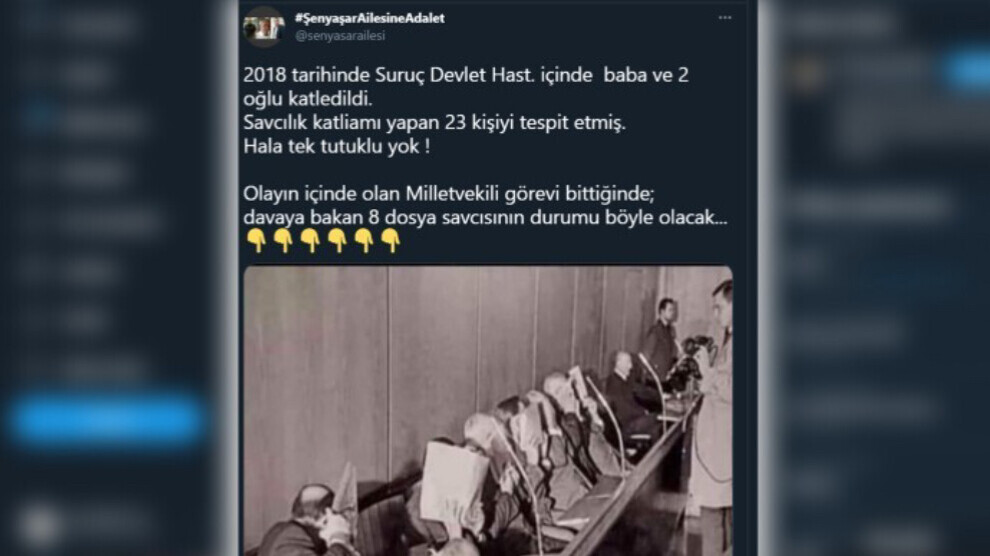 “Sala 2018’an li Nexweşxaneya Dewletê ya Pirsûsê bav û 2 kur hatin qetilkirin. Dozgeriyê 23 kesên ku komkujî kirin tespît kir. Hîn jî kes nehatiye giritn. Dema ku wezîfeya wekîlê ku di nava bûyerê de ye qediya, rewşa 8 dozgerên vê dosyayê jî wê bi vî rengî be…”