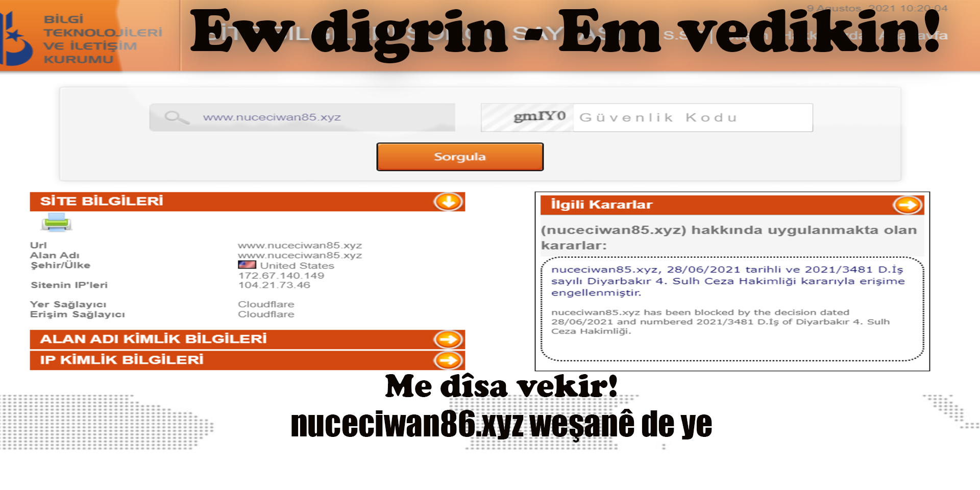 NAVENDA NÛÇEYAN – Saziya Ragihandin û Teknolojiyên Agahiyan (BTK) malpera ajansa me ya bi navê nuceciwan85.xyz ku beriya gelek caran hatibû girtin carekî din asteng kir. BTK’ê ji bo astengkirinê hinceta biryarên Dadgeha Sulh a 4’mîn a Amedê nîşan da. Ajansa Ciwanan “Nûçe Ciwan” li hember zext û sansûrên dewleta Tirk a dagirker berxwedana xwe didomine.