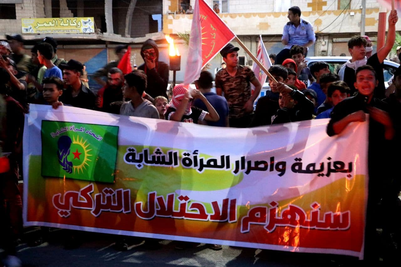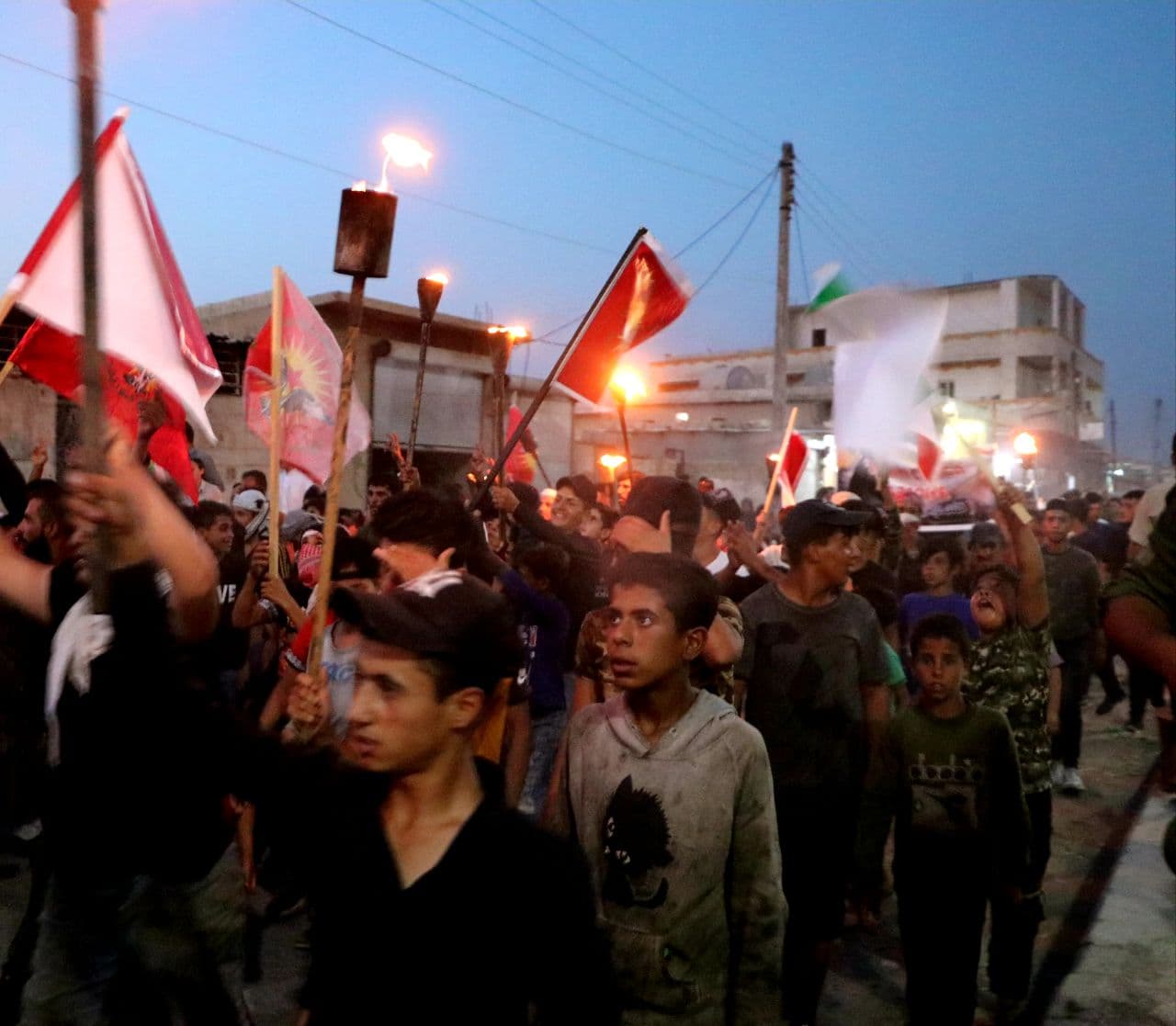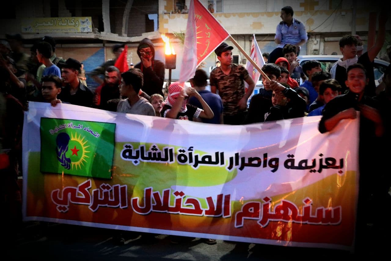 TEBQA – Tevgera Ciwanên Şoreşger û Yekitiya Jinên Ciwan li herêma Mensûra ya Tebqayê bi diruşma “Werin cenga azadiyê” meşeke meşaleyî ji bo şermezarkirina êrişên dagirkeriya Tirk li dijî herêmên Bakur û Rojhilatê Sûriyê, li dar xist.
