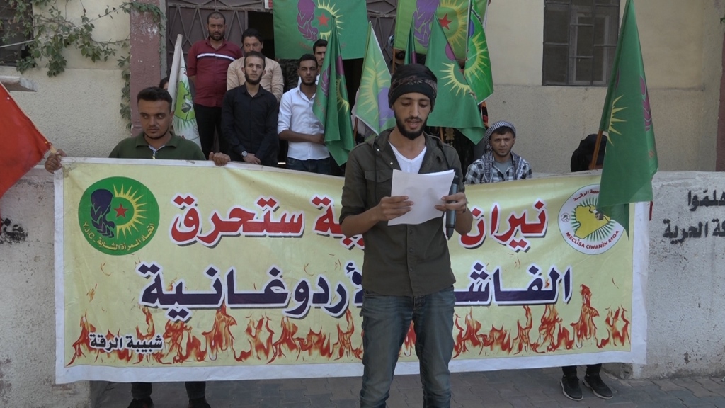 REQA – Bi dehan endamên Tevgera Ciwanên Şoreşger a Sûriyê û Yekitiya Jinên Ciwan a Reqayê li ber navenda xwe ya naverasta bajar kom bûn û bi daxuyaniyekê êrişên dewleta Tirk ên li ser Şengalê şermezar kirin. Endamê tevgerê Arif El-Elî daxuynî xwend.