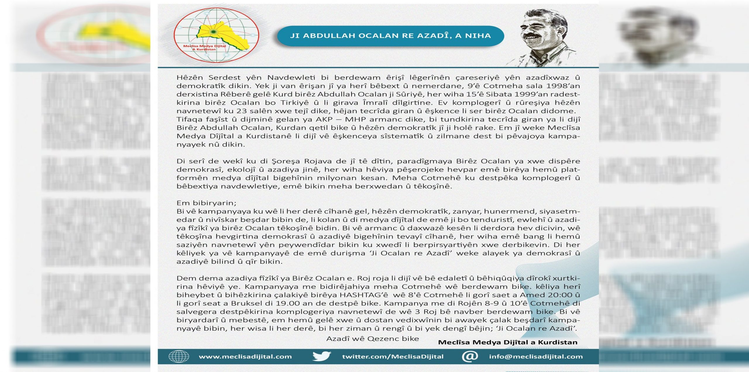 NAVENDA NÛÇEYAN – Meclisa Medya Dijîtal a Kurdistanê bi daxuyaniyekê ragihand ku li hember tecrîda li ser rêber Abdullah Ocalan dê kampanyayekê pêk bînin. Meclisê di daxuyaniye xwe de wiha da zanîn: