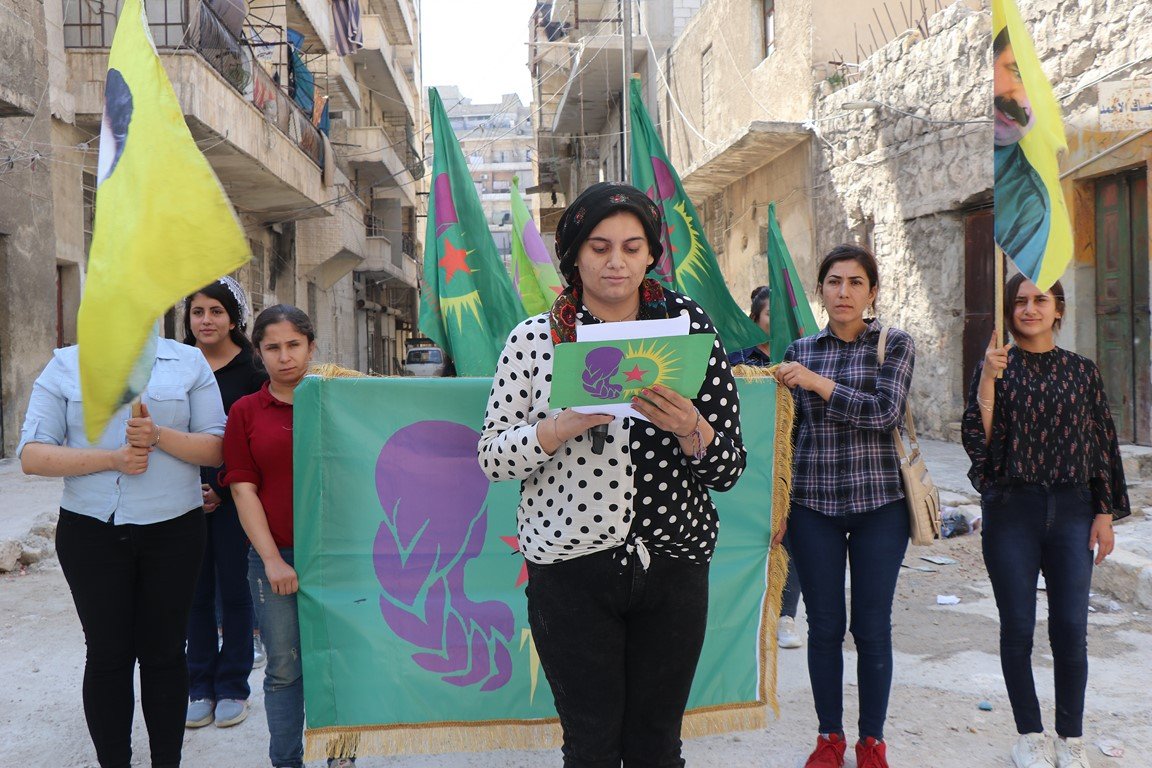 Di vê çarçoveyê de, Yekîtiya Jinên Ciwan li taxên Şêxmeqsûd û Eşrefiyê yên Helebê bi beşdariya bi dehan endamên Yekîtiya Jinên Ciwan li ber navenda wan a li rojhilatê taxa Şêxmeqsûd, daxuyaniyek ji raya giştî re pêşkêş kir.