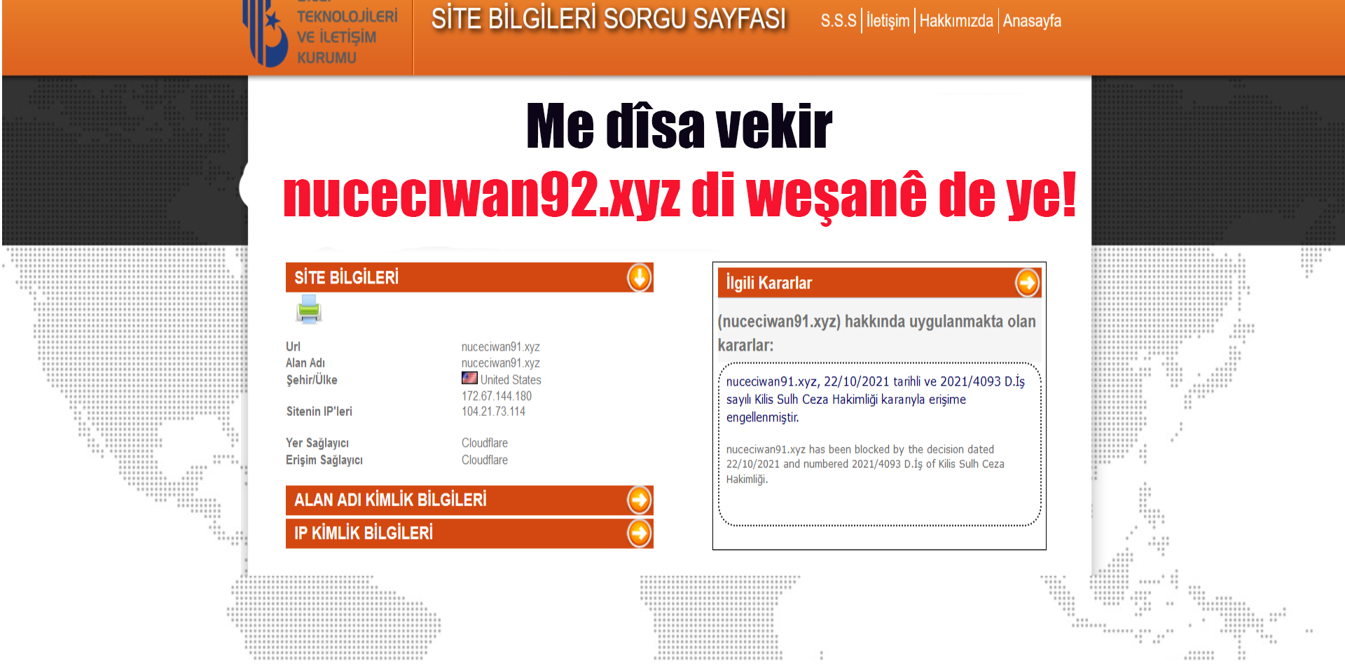NAVENDA NÛÇEYAN – Saziya Ragihandin û Teknolojiyên Agahiyan (BTK) malpera ajansa me ya bi navê nuceciwan91.xyz ku beriya gelek caran hatibû girtin carekî din asteng kir. BTK’ê ji bo astengkirinê hinceta biryarên Dadgeha Sulh a Kilîsê nîşan da. Ajansa Ciwanan “Nûçe Ciwan” li hember zext û sansûrên dewleta Tirk a dagirker berxwedana xwe didomine.