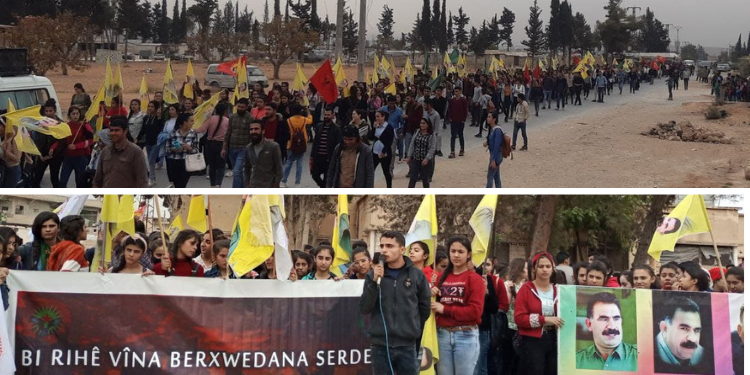 Di çalakiyê xwepêşandanê de xwendekaran alên Tevgera Xwendekarên Demokratîk û Tevgera Ciwanên Şoreşger ên Sûriyê, wêneyên rêberê Gelan Abdullah Ocalan û pankartên “Bi rihê berxwedana serdemê em ê azadiya Efrînê misoger bikin û dagirkeriya Tirk têk bibin”, “Li dijî îxanet û dagirkeriyê meşa rûmetê”hildan.