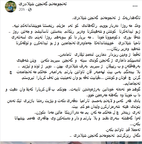 ŞELADIZÊ – Meclisa Ciwanên Şêladizê ragihand ku ewê dijî şehîdxistina Wezîr Teyîp a ji aliyê çekdarên PDK’ê ve, xwepêşandek girseyî lidarbixin. Meclîsa Ciwana banga beşdariyê li hemû xelkê herêmê kir.