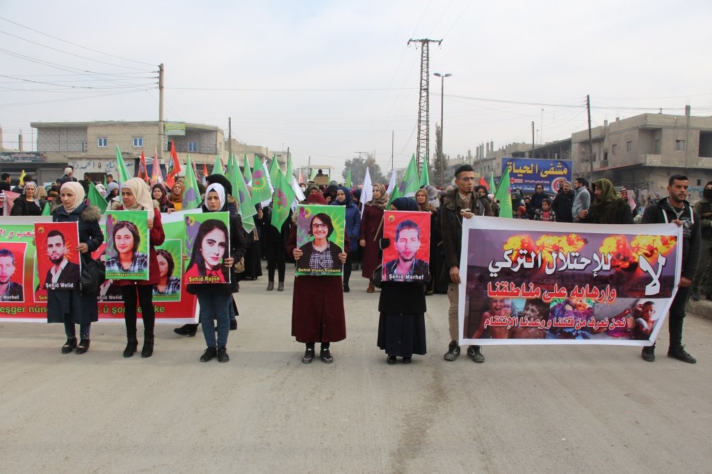 MINBIC – Bi armanca şermezarkirina sûcên artêşa Tirk îro Tevgera Ciwanên Şoreşger û Yekitiya Jinên Ciwan li Minbicê û gundewarên wê meşek li dar xist.