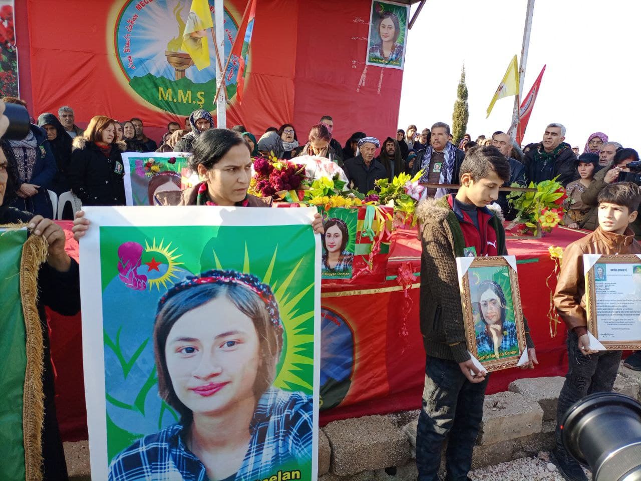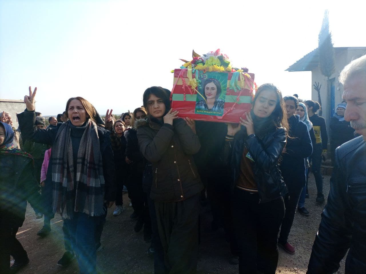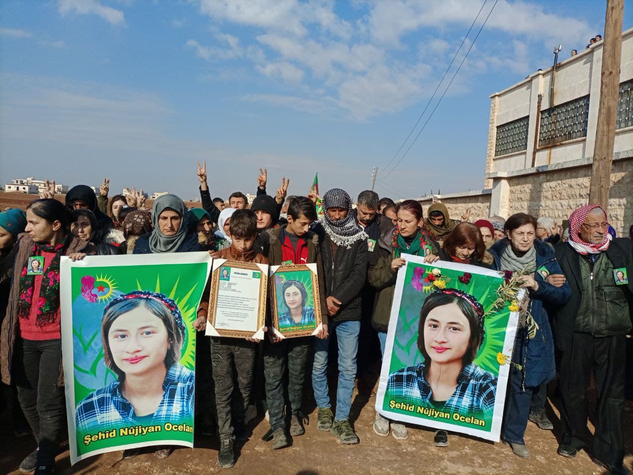 ŞEHBA – Bi hezaran şêniyên herêma Efrînê ji Kurd, Ereb û Kurd cenazeya endama Yekitiya Jinên Ciwan Emîne Mihemed (Nûjiyan Ocalan) a 25’ê Kanûnê tevî 4 hevalên xwe di bomebebarana dewleta Tirk a dagirker a li Kobanê şehîd bûbû, ji nexweşxaneya Avîn ya kantona Şehbayê wergirtin û bi karwanekî ber bi goristana Şehîdên Berxwedana Serdemê ya navçeya Ehrezê ve çûn.