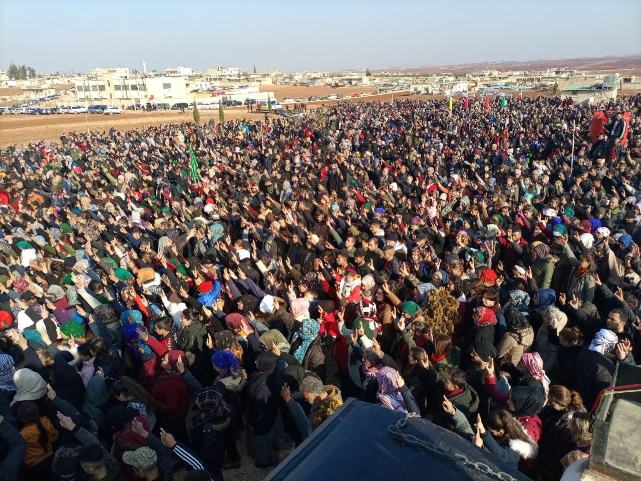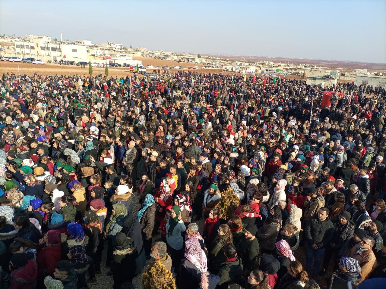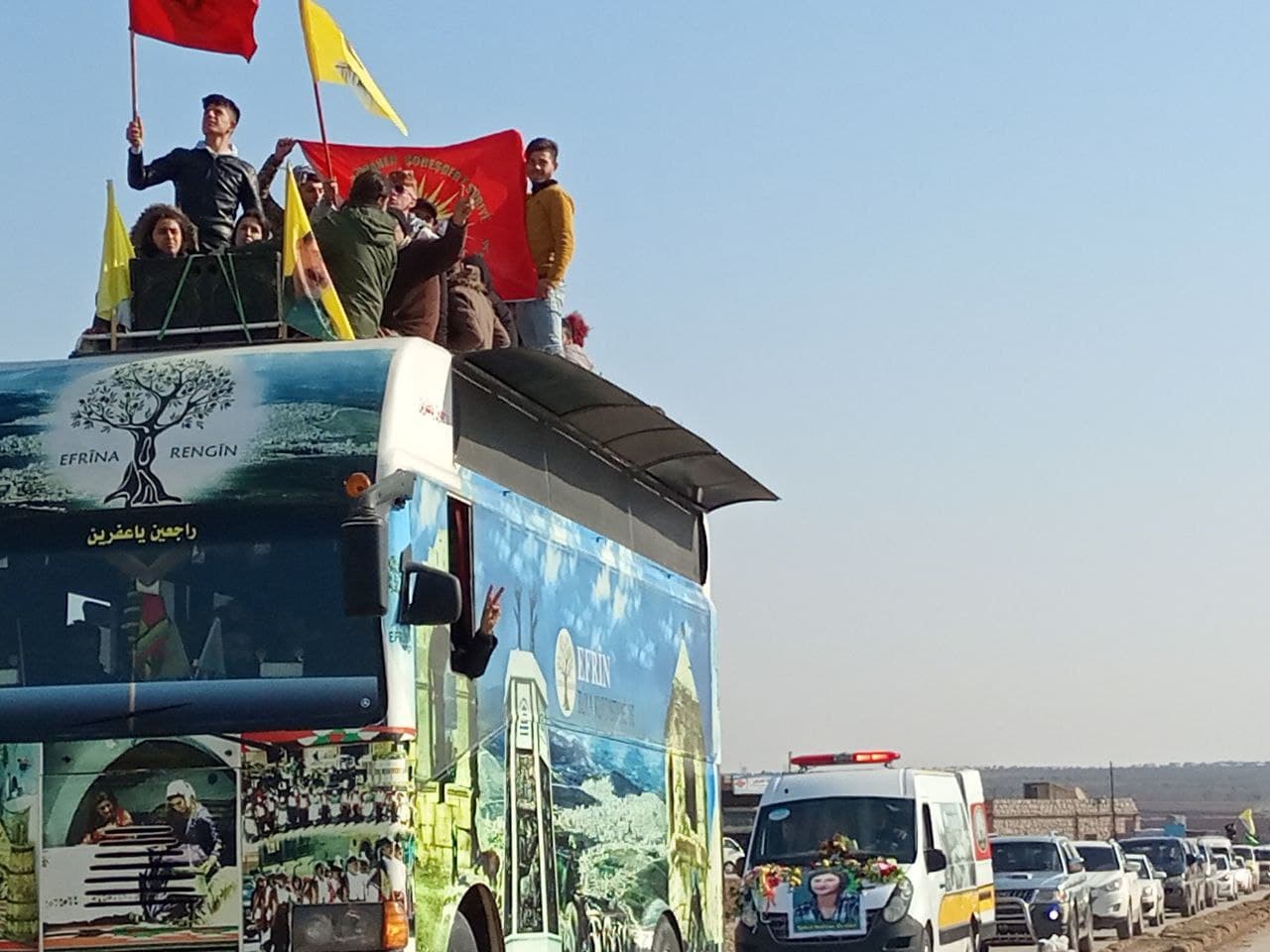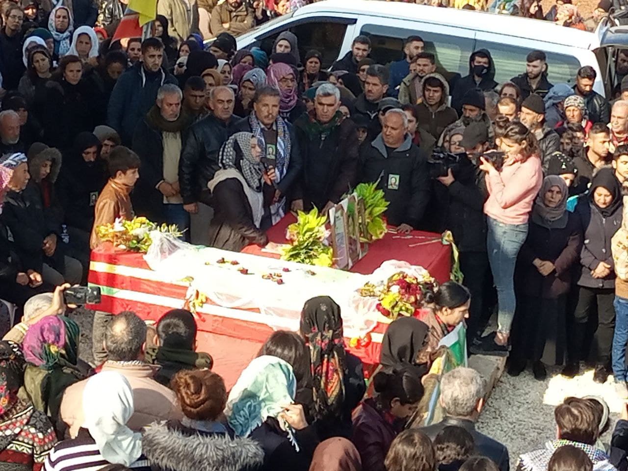 ŞEHBA – Bi hezaran şêniyên herêma Efrînê ji Kurd, Ereb û Kurd cenazeya endama Yekitiya Jinên Ciwan Emîne Mihemed (Nûjiyan Ocalan) a 25’ê Kanûnê tevî 4 hevalên xwe di bomebebarana dewleta Tirk a dagirker a li Kobanê şehîd bûbû, ji nexweşxaneya Avîn ya kantona Şehbayê wergirtin û bi karwanekî ber bi goristana Şehîdên Berxwedana Serdemê ya navçeya Ehrezê ve çûn.