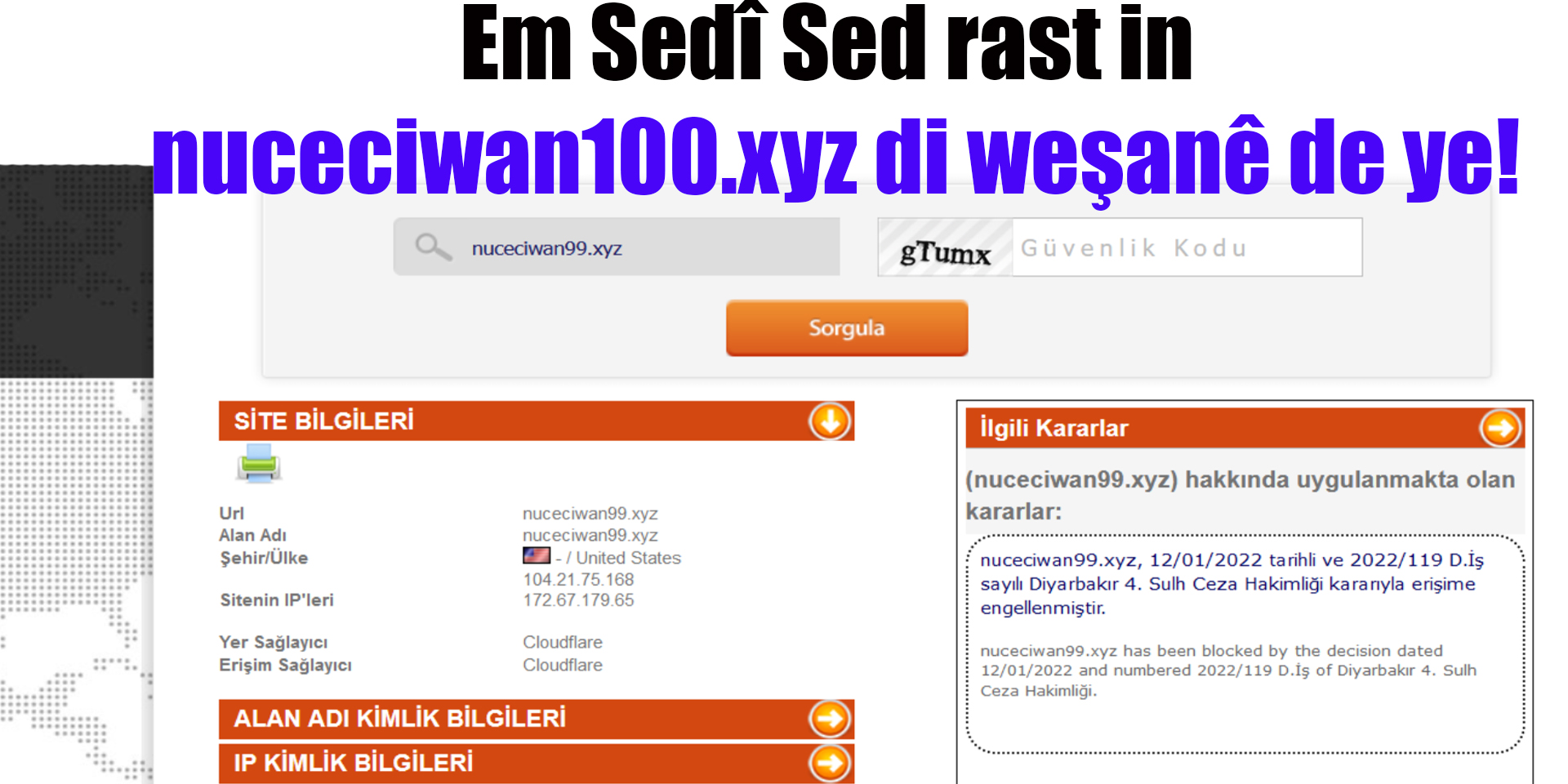 NAVENDA NÛÇEYAN – Saziya Ragihandin û Teknolojiyên Agahiyan (BTK) malpera ajansa me ya bi navê nuceciwan82.xyz ku beriya gelek caran hatibû girtin carekî din asteng kir. BTK’ê ji bo astengkirinê hinceta biryarên Dadgeha Sulh a 4’mîn a Amedê nîşan da. Ajansa Ciwanan “Nûçe Ciwan” li hember zext û sansûrên dewleta Tirk a dagirker berxwedana xwe didomine.