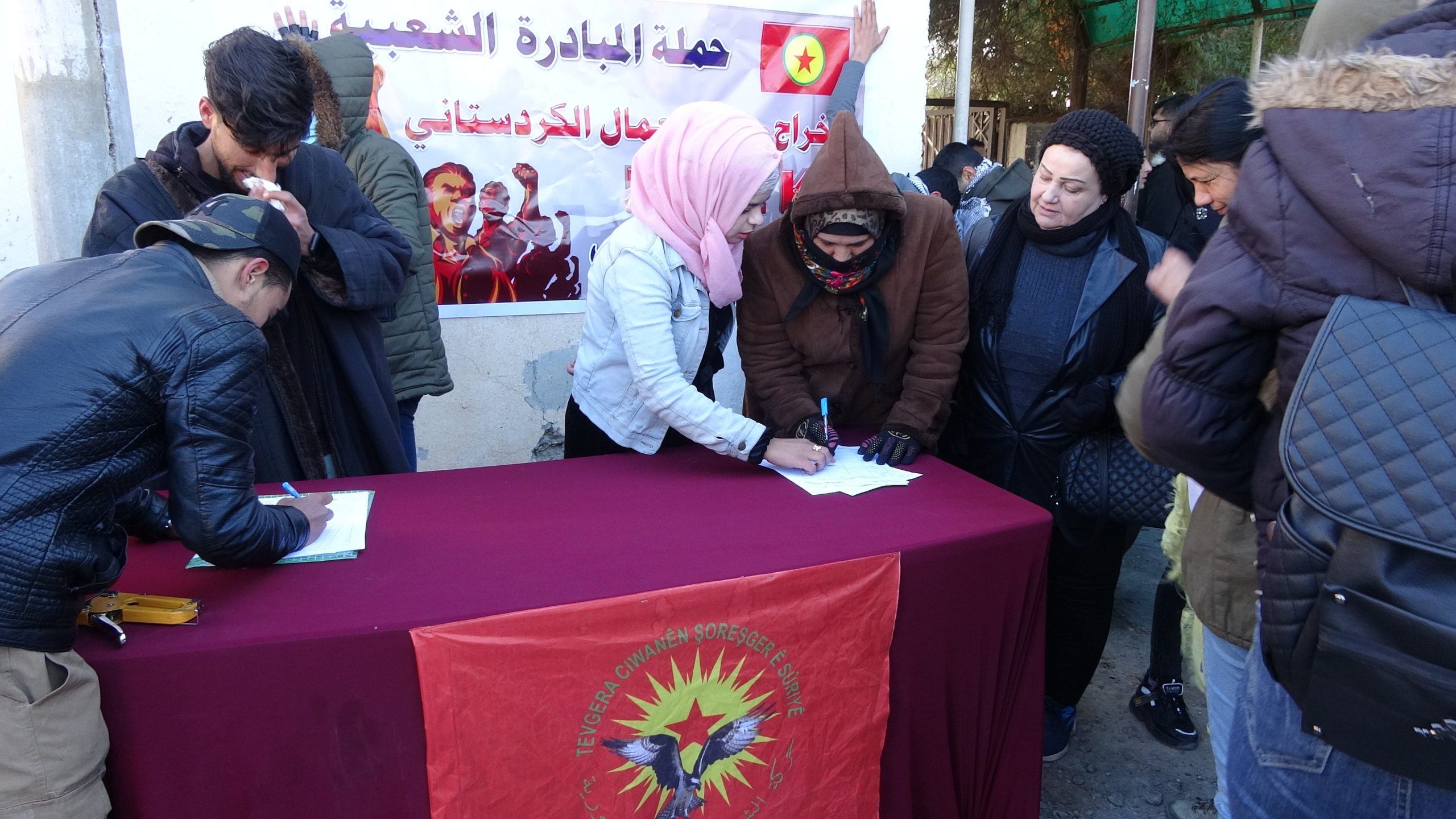 Em di însiyatîfa gel de, bi rihê ciwanên şoreşger û jina azad û bi îradeya serkeftinê tevlîbûna xwe ji pêngava cîhanê re radighînin û dest bi pêngava komkirina îmzeyan li Bakur û Rojhilatê Sûriyê dikin. Em soz dikin ku em ê têkoşîna xwe xurt bikin da ku navê PKK`ê ji ”lîsteya terorê” rakirin û bang li YE`yê, Amerîka, Rûsya û hemû cîhanê dikin ku navê PKK`ê ji lîsteyê rakin.”