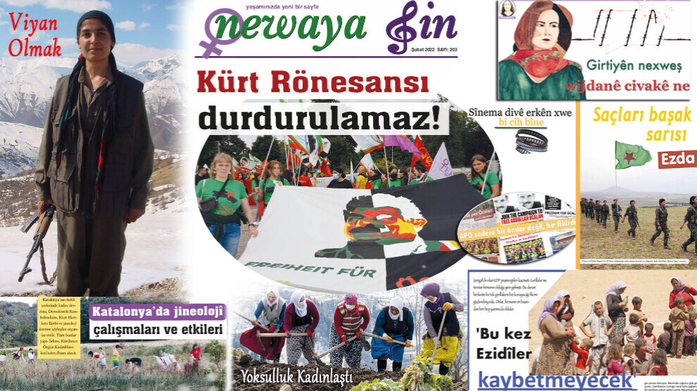 NAVENDA NÛÇEYAN – Hejmara meha Sibatê ya rojnameya Newaya Jin bi manşeta “Pêşî li ronesansa Kurdan nikare bê girtin” hate weşandin. Di hejmara Sibatê ya rojnameyê de rojevên Başûr û Îranê, polîtîkaya dewleta Tirk a li ser zindanan, qirkirina jinê, xizankirina jinê, biyografiyên jinên berxwedêr û serpêhatiya sînemaya Kurd hatin nirxandin.