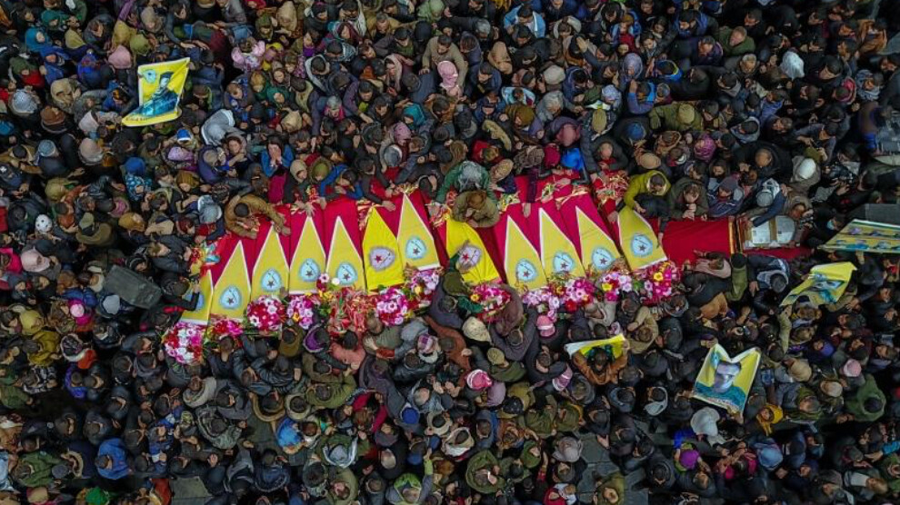 KOBANÊ – Cenazeyên 12 şehîdên Hêzên Sûriya Demokratîk (QSD) îro bi beşdariya bi deh hezaran şêniyên herêma Firatê li goristana şehîd Dîcle li başûrê bajarê Kobanê, hatin oxirkirin.