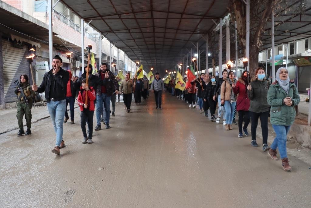 Meş li sûka navendî rawestiya. Bi navê ciwanan, endama Yekitiya Jinên Ciwan Nûr Mehmûd daxuyanî xwend. Di daxuyaniyê de komploya navneteweyî ya li dijî rêber Abdullah Ocalan û êrişên domdar ên dewleta Tirk a dagirker ên li ser Bakur û Rojhilatê Sûriyê hatin şermezarkirin.