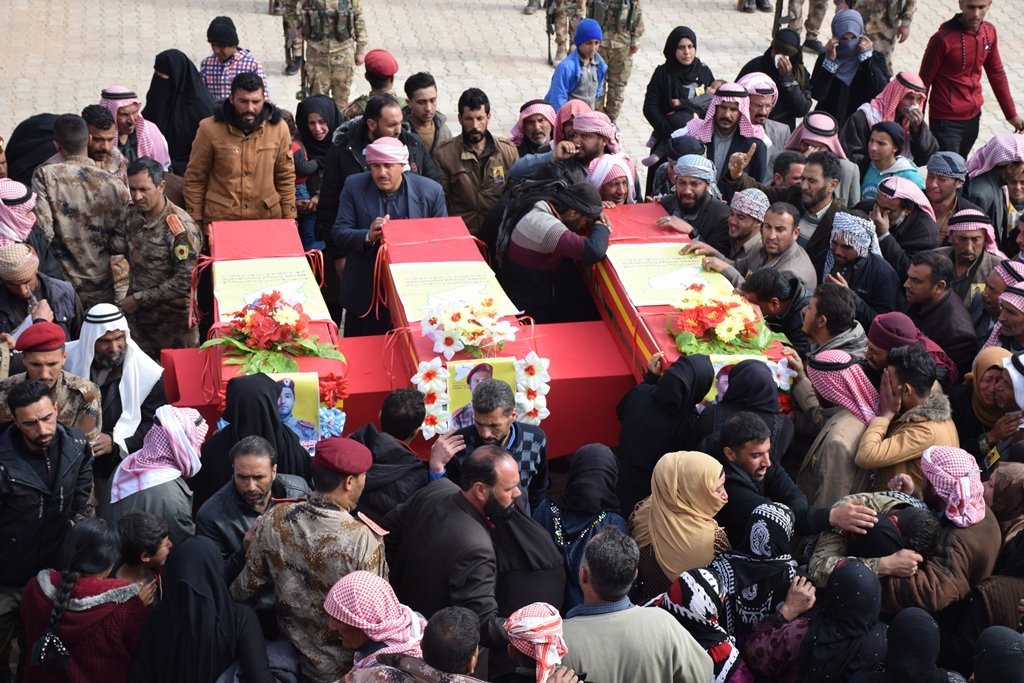 ŞEDADÊ – Bi sedan şêniyên herêma başûrê kantona Hesekê cenazeyên 3 şehîdên Hêzên Sûriya Demokratîk (QSD); Teysîr Ehmed El-Xelef, Hîşam Xelef El-Hisên û Cemîl Ayid El-Heşîm li goristana şehîdan a navçeya Şedadê veşartin. Her sê şervan li bajarokê Hecîn ê Dêrazorê şehîd bûbûn.