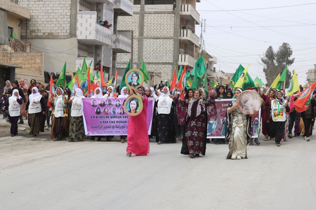 HESEKÊ – Bi boneya Roja Cîhanî ya Jinên Kedkar 8’ê Adarê, li seranserî Rojavayê Kurdistanê û Bakur-Rojhilatê Sûriyê ve, jin di nava tevgerê de ne.