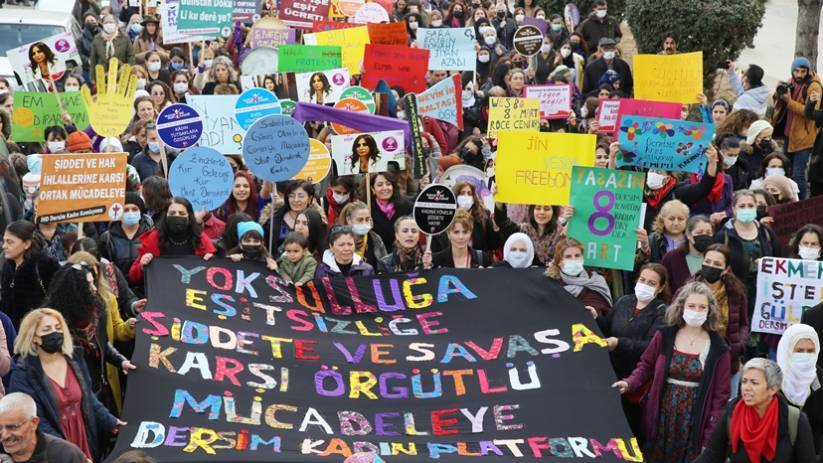 DÊRSIM – Platforma Jinê ya Dêrsimê bi dirûşma “Li dijî xizanî, newekhevî, tundî, şer ber bi têkoşîna rêxistinkirî ve” li Qada Seyîd Riza 8’ê Adarê Roja Jinan a Cîhanê pîroz dikin. Jinên di saetên serê sibehê de hatin Kuçeya Hunerê dowizên bi nivîsên “Ji jinên girtî re azadî”, “Jin welatê jinê ye”, “Li dijî xespa kedê em bi rêxistin in”, “Li dijî desthildatdariya mêr em li ser piyan e”, “Li dijî polîtîkayên bêcezahiştinê ber bi têkoşînê ve” û wêneyên Aysel Tugluk a girtî û Semra Guzel a ku parlamenteriya wê hat xistin hatin hilgirtin.