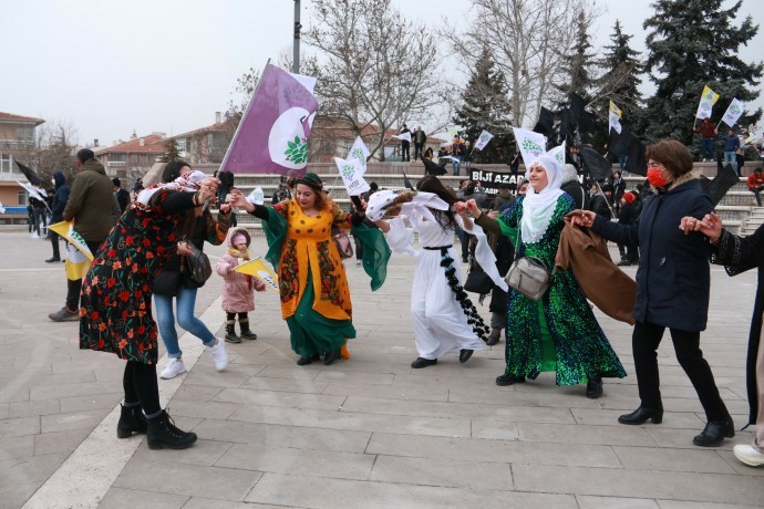 Welatiyên li Enqereyê li Anitparkê bi dirûşma “Dem dema sekeftinê ye” kom bûn û bi gerandina govendê dest bi pîrozbahiya Newrozê kirin. Jin bi kincên we yên kurdî herikîn qadê û lîrandin. Dowizên wêneyên Deniz Poyraz a li Îzmîrê hat qetilkirin, Garibe Gezer a li girtîgehê hat qetilkirin û Kemal Kurkut ê li Newroza Amedê hat qetilkirin ji aliyê polîsan ve hatin astengkirin û polîsan ew negirtin qadê. Komîteya Tertîpê jî bi gotina “Kemal Kurkut, Deniz Poyraz Garibe Gezer nemir in” bersiv dan polîsan.
