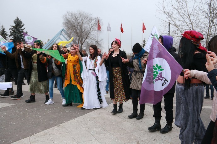 Li Çewlîkê bi hezaran kes serê sibehê li Kolana Nexweşxaneyê bi cil û bergên xwe yên kurdî kom bûn. Çefiyên kesk û sor û zer dan hustê xwe û dirûşmên “Jin, jiyan, azadî” û “Bê serok jiyan nabe” hatin berzkirin. Bi def û zirneyê govend hat gerandin. Hatina gel a qadê hîn didome.
