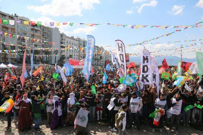 Li Îzmîrê, pîrozkirina Newrozê ku bi şîara “Dem, dema serkeftinê ye” tê pîrozkirin, bi dûrişmeya “Bijî Serok Apo” û “Em ê bi berxwdanê qezend bikin” dest pê kir. Îzmîrî, di saetên serê sibehê de ji bo ku bikevin Qada Gundogdûyê ji gelek deverên bajar hatin ber du nuqteyên kontrolê û li hev kom bûn. Girse saet di 13.00’an de ke qadê. Partiyên siyasî û sendîka bi pankart û dovîzan bi awaeykî kortej ketin qadê. Jin û ciwan bi kincên xwe yên herêmî tevlî Newrozê bûn û reng dan pîrozbahiyê.