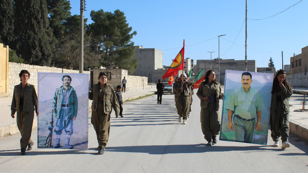 KOBANÊ – Yekîtiya Jinên Ciwan bi boneya Hefteya Lehengiyê li qada şehîd Egîd ya bajarê Kobanê meresimek leşkerî li dar xist û daxuyanî dan çapmeniyê. Di meresimê de jinên ciwan wêneyê Rêberê Gelan Abdullah Ocalan û Fermandarê Efsanewî Egîd û alên PKK’ê hildan.