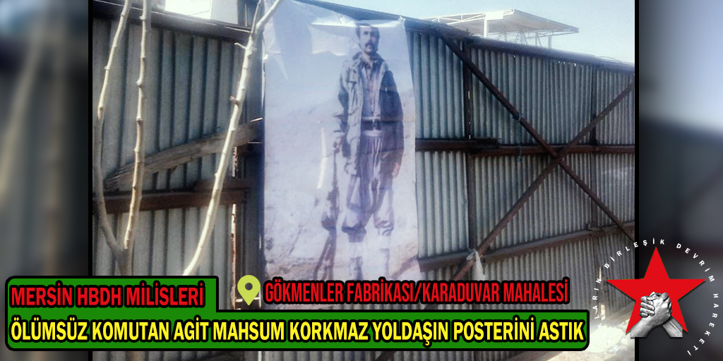 MÊRSÎN – Milîsên girêdayî Tevgera Şoreşger a Yekbûyî ya Gelan (HDBH) posterê fermandarê pêngava 15’ê Tebaxa 1984’an Mahsûm Korkmaz (Egîd) ku guleya yekemîn li dijî dewleta Tirk hate avêtin, li taxa Karadûvar a Mêrsînê daliqandin.