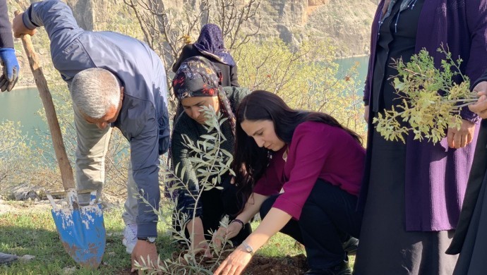 Parlamentera Rihayê ya Partiya Demokratîk a Gelan (HDP) Ayşe Surucu, rêveberên HDP’ê yên rêxistina navçeya Xelfetiyê û endamên Partiya Herêman a Demokratîk (DBP) li taxa Vahna ya li qiraxa Çemê Firatê, ji bo rojbûna 73’an a Rêberê Gelê Kurd Abdullah Ocalan şitil çandin.