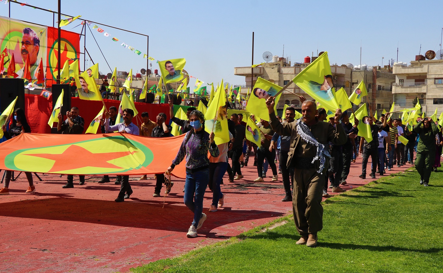 QAMIŞLO – Bi dirûşma “Dem dema azadiya Rêber Apo ye” Tevgera Ciwanên Şoreşger ên Sûriyê li herêma Cizîrê bi boneya rojbûna Rêberê Gelan Abdullah Ocalan, li Stada 12`ê Adarê şahiyek li dar xistin.