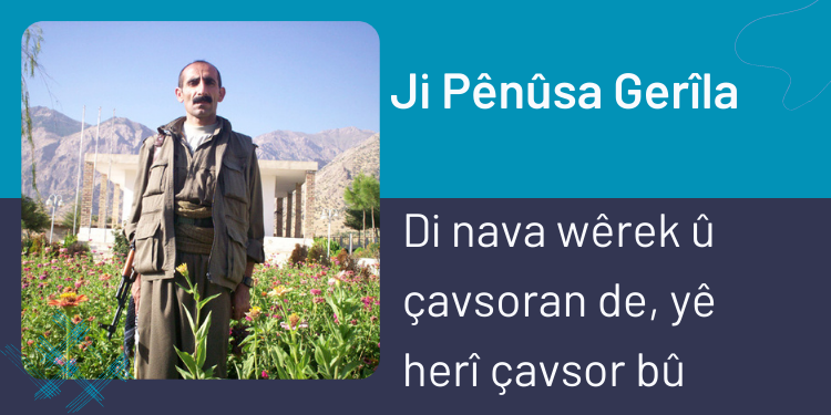 Yekî gelek hestiyar bû, ji der ve kesekî pir hişk dixuya bû, lê rojnivîsa wî ya bi dizî digirt hebû. Di rojnivîsî de hevalên ku ligel wî şehîd ketine dinivîsand. Di rojnivîska xwe de stêrk çêdikir, li binê her stêrkekê de navê hevalekî/ê ku ligel wî şehîd ketiye dinivîsand. Ji bo van hevalan helbestên wî yên kurt hûbûn. Kesî nizanî bû rojnivîsa wî heye û ji kesî re nedixwend, yekî hişk xuya dikir û herkesi/ê wer nasdikir. Di civîna konseya leşkeri ya 2011’an de jê hatibû xwestin ku bîranînên xwe binivîsîne, wê jî hevoka “ na, nikarim, nabe” bikaranîbû. Dema min got rojnivîsa hevalê Mehmet heye yê herî şaş man rêvebirên rêxistinê bûn. Kesî bawer nedikir ku hevalê Mehmet rojnivîs bigre. Vana didan xuyakirin ku hevalê Mehmet kesekî gelek hestiyar bû. Ji ber vê ji dûr ve naskirina hevalê Mehmet nabe. Pêwîst bû pêre bihata jiyîn.