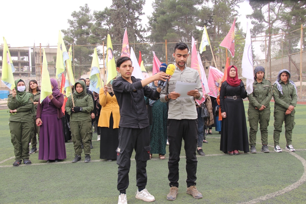 MINBIC – Endamên Tevgera Ciwanên Şoreşger a Sûriyê û Kombûna Jinan a Zenûbya ya Minbic û Gundewarên wê li Stada Sudasî ya li naverasta bajêr daxuyaniyek da. Hevserokê Tevgera Ciwanên Şoreşger a Sûriyê ya Minbicê Ehmed El-Cimêlî daxuyanî xwend.