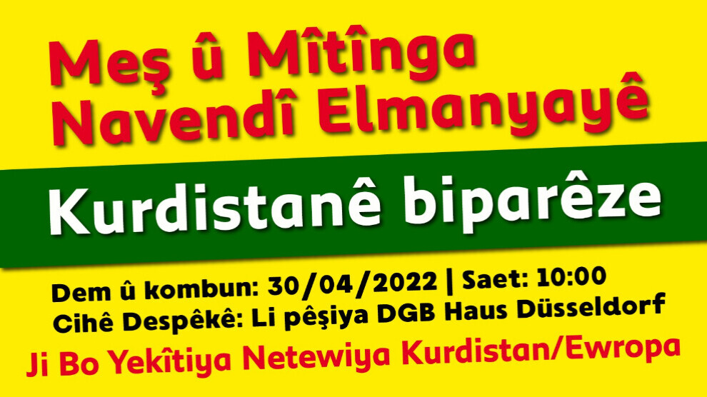Em weke sazî û partiyên Kurdistanî yên ku îmzeya wan li jêr heye, di 30’ê Nîsanê de li bajarê Elmanya Dusseldorfê bi dirûşmeya ‘Em li dijî dagirkeriya dewleta Tirk û alîgirê wê Kurdistanê biparêzin’ meş û mîtînga navendî organîze dikin.
