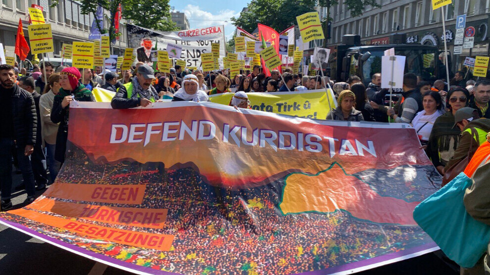 DUSSELDORF – Bi hezaran kesên li bajarê Dusseldorfê yê Elmanyayê kom bûn, êrişên dagirker ên ku dewleta Tirk di 17’ê Nîsanê de dabû destpêkirin û îxaneta PDK’ê bi slogana ‘Kurdistanê biparêze’ şermezar dikin.