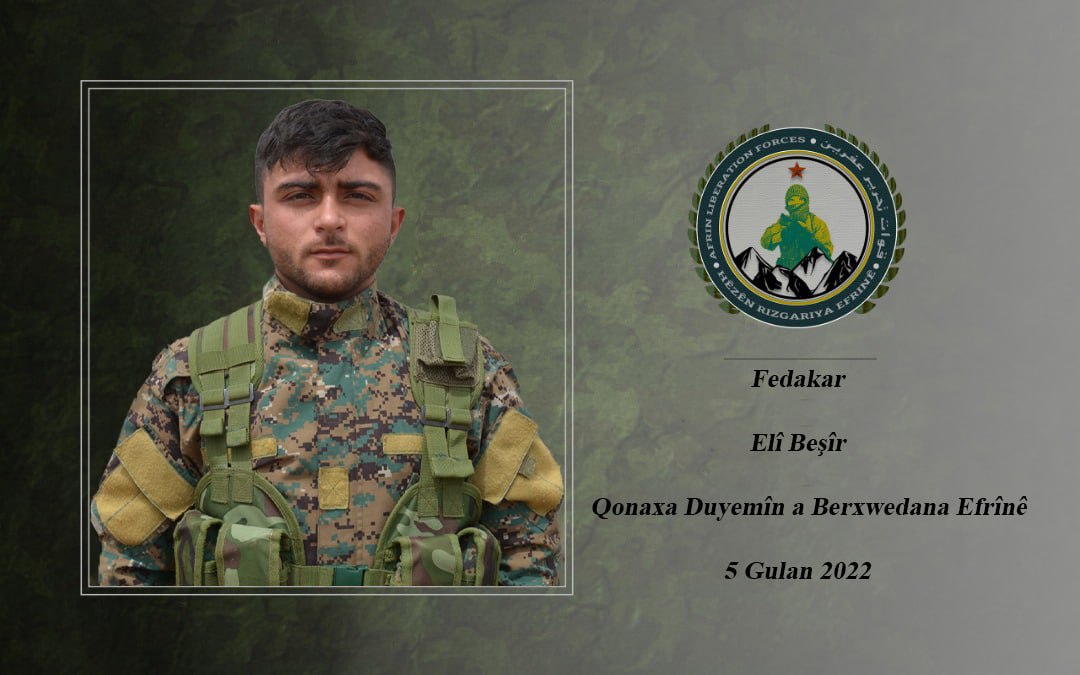 Em hevrêyê xwe Fedakar bi rêzdarî bibîr tînin. Hevrêyê me Fedakar roja 5ê Gulanê dema li ser erka xwe bû, gihîşt şehadetê. Piştî dagirkirina Efrînê weke Qonaxa duyemîn a Berxwedana Serdemê ji bo rizgarkirina Efrînê têkoşîneke bêeman tê meşandin. Di vê tekoşîna meya li dijî dagirkerîyê de ciwanên me berê xwe didin nav refên hêzên me ku yek ji wan jî hevrêyê me Fedakar e. Hevrêyê me Fedakar li herêma berxwedanê yê Efrînê li nava malbateke welatparêz mezin bû. Hem welatparêzîya malbatê hem jî tevlîbûna nasên wî li nav şoreşê bandoreke mezin li ser hevrêyê me kir. Piştî dagirkirina Efrînê hevrêyê me Fedakar jî biryara tevlîbûna li nav têkoşîna azadîyê da. Erka herî zehmet erka şoreşê li ser milê xwe girtine û hevrêyê me jî bi dil û can vê erka pîroz heya kêlîya dawî bi cîh anî.