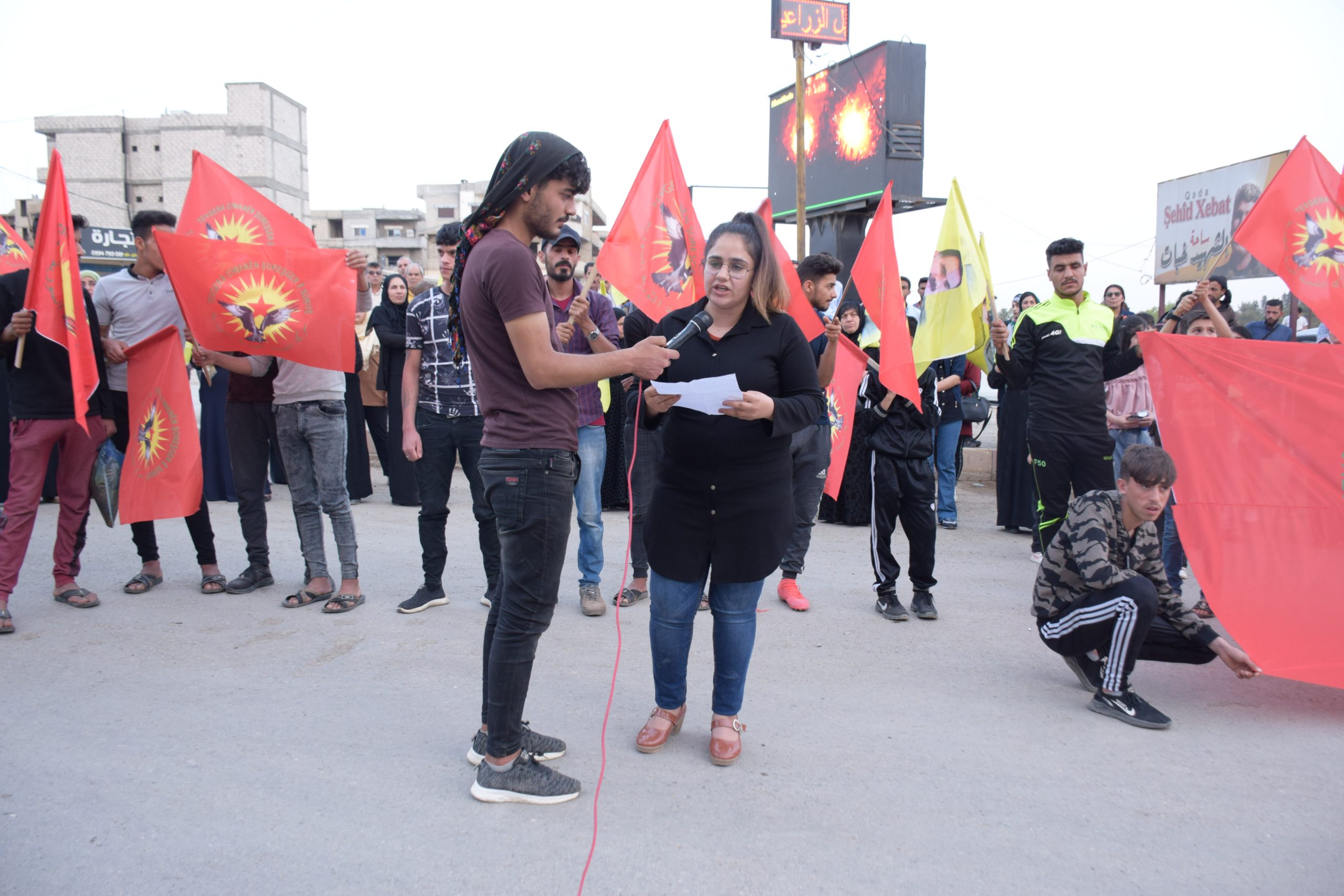 QAMIŞLO – Bi dehan endamên Tevgera Ciwanên Şoreşger A Sûriyê li qada Şehîd Xebat a navçeya Girkê Legê ji bo şermezarkirina êrişên dewleta Tirk a dagirker, kom bûn.