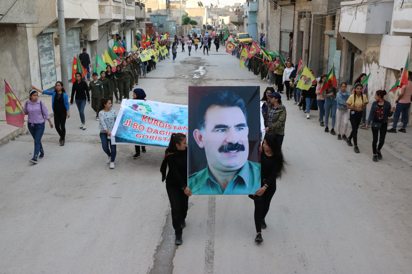 Beşdar li pêşiya hola civînan a li aliyê rojavayê taxa Şêxmeqsûd kom bûn, wêneyên Rêberê Gelan Abdullah Ocalan, ala PKK`ê û HPG`ê hildan.