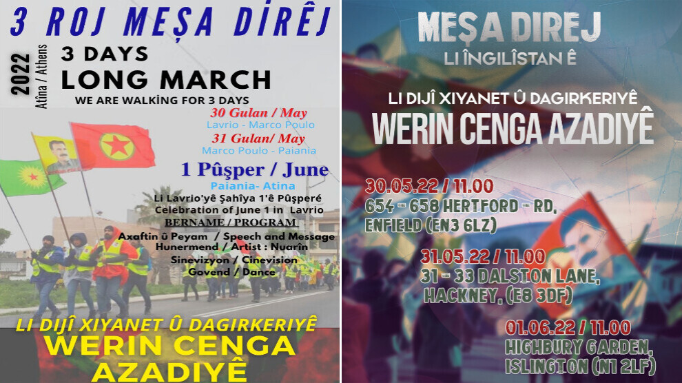 Meşa ku wê 30’ê Gulanê destpê bike, di 1’ê Hezîranê de li ber Konsolosxaneya Tirk a li Atînayê wê bi dawî bibe. Piştî meşê em ê tevlî pîrozbahiyên 1’ê Hezîranê yên li Lavrîoyê bibin. Hunermend Nûarîn jî wê tevlî bibe. Em dibêjin ku em ê bi ruhê 1’ê Hezîranê bimeşin. Em bang li ciwanên Kurdistanê û dostan dikin ku xwedî li berxwedana bêhempa ya gerîlayên Kurdistanê derkevin û li dijî dagirkerî û xiyanetê têbikoşin.