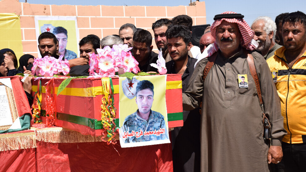 QAMIŞLO – Bi sedan şêniyên navçeya Tirbespiyê ya Kantona Qamişloyê ji serê sibê ve berê xwe dan Goristana Şehîd Dilşêr a gundê Dugirê yê navçeya Tirbespiyê û tev li meresima veşartinê ya Şehîd Mihemed El Sayil bûn. Endamê Hêzên Erka Xweparastinê Mihemed El Sayil 28’ê Gulanê li ser erka xwe şehîd bû.