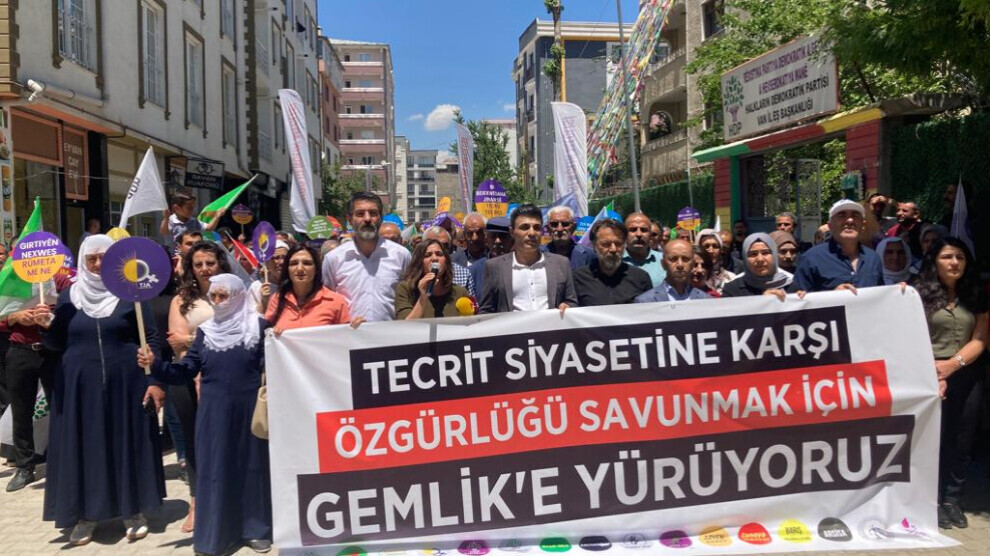 Beriya meşa ku bi dirûşma “Em ê li dijî polîtîkayên tecrîdê, ji bo parastina azadiyê ber bi Gemlîkê ve bimeşin” pêk were gel li ber avahiya HDP’ê yê Bajarê Wanê hatin cem hev û daxuyanî dan.